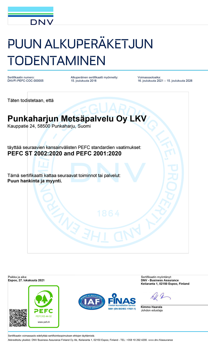 Punkaharjun Metsäpalvelu Oy LKV:llä on DNV GL Business Assurance Finland Oy Ab:n myöntämä puun alkuperäketjun todentamisen sertifikaatti nro DNVFI-PEFC-COC-000005, joka täyttää kansainvälisten PEFC standardien PEFC ST 2002:2020 ja PEFC ST 2001:2020 mukaiset vaatimukset. Sertifikaatti kattaa puun hankinnan ja myynnin