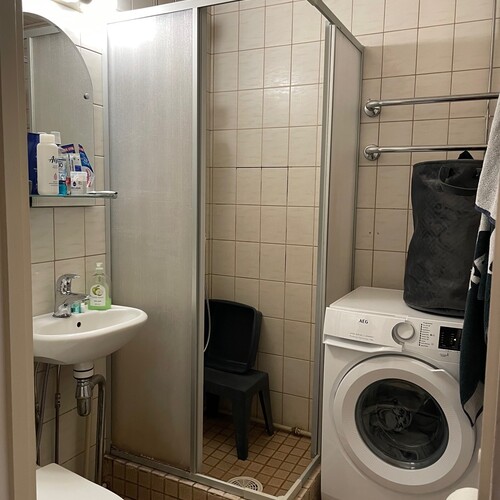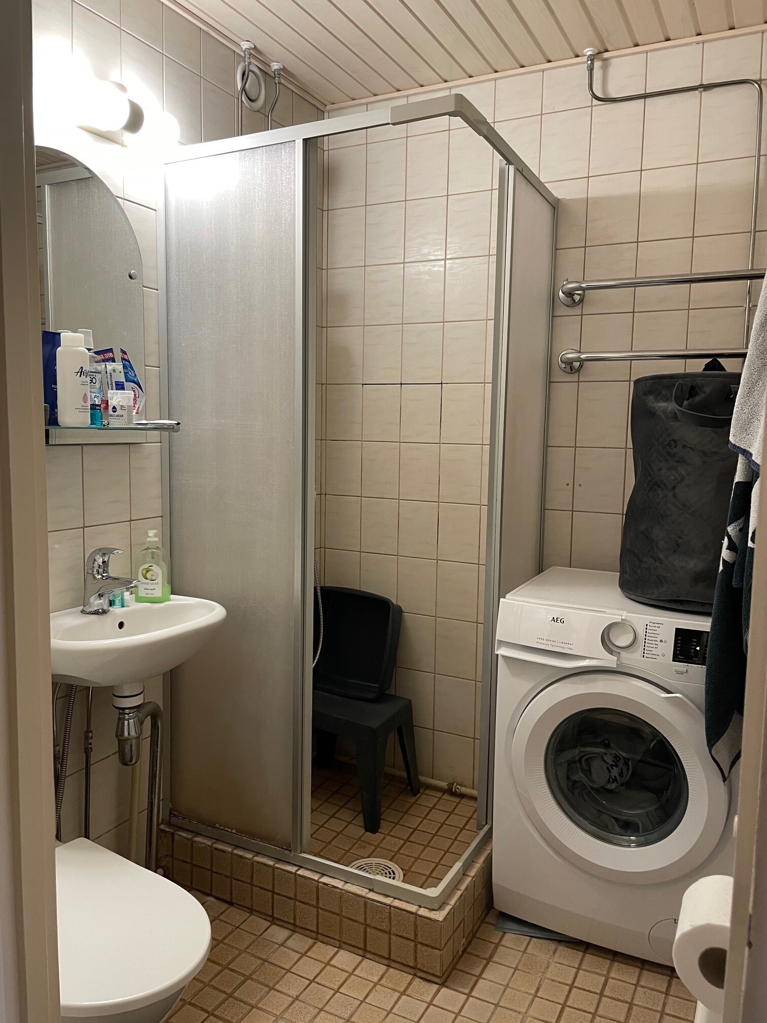 Varusteet: pesukoneliitäntä, suihkukaappi, peili