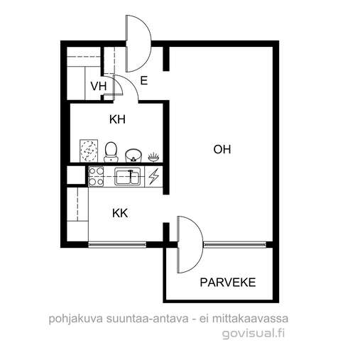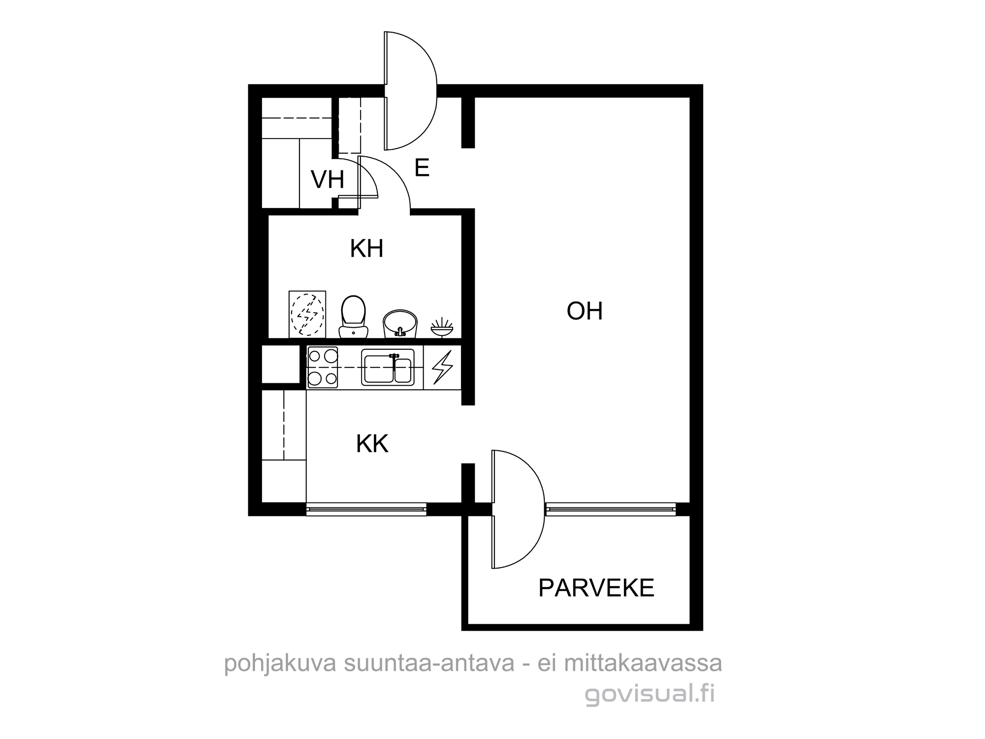 Varusteet: jääkaappipakastin, sähköliesi, liesituuletin hormilla