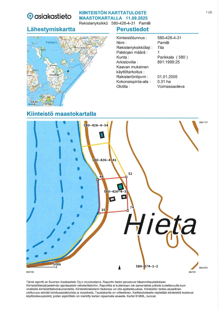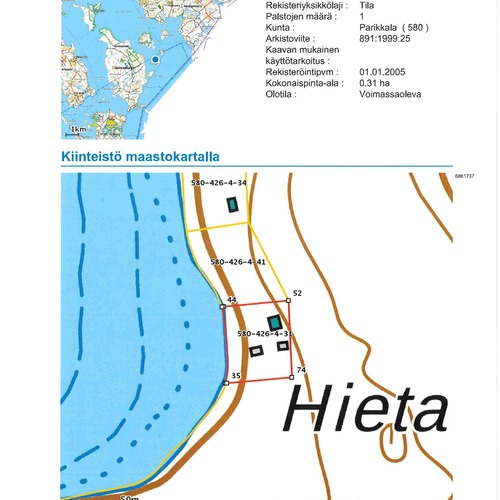 Parikkalassa Uukuniemellä Hietasaaressa vuonna 2007 valmistunut hirsirakenteinen huvila. Huvilassa on kaksi makuuhuonetta, tupakeittiö, vaatehuone ja terassi. Lämmönlähteenä huvilassa on takka/leivinuuni ja puuhella. Valaistus ja TV toimii aurinkopaneelisähköllä. Lisäksi huvilassa on kaasuliesi/uuni ja kaasulla toimiva jääkaappi. Huvilassa ei ole juoksevaa vettä. Juomavesi on tuotu mukana ja muu käyttövesi on otettu järvestä. Muita rakennuksia huvilan lisäksi kiinteistöllä ovat saunamökki, kolme pientä varastorakennusta ja kompostoiva ulkokäymälä. Saunamökki on rakennettu vuonna 2005. Saunamökin varusteisiin kuuluu varaava takka. Kiinteistöllä on kelluva venepaikka Värtsin kalasatamassa. Venematka kalasatamasta on n. 6,20 km jonka aikana pääsee ihastelemaan Pyhäjärven hienoja maisemia. Kalasatamasta voi hakea myös juomavettä. Pyhäjärvi on kirkas vetinen ja kalaisa järvi. Kiinteistön rannan ilmansuunta on mukavasti länteen päin. Rantaviivassa on kiveä mutta ranta muuttuu etempänä hiekkapohjaiseksi. Kiinteistön viereinen tontti on rakentamaton ja toiselle puolelle ei ole kaavoitettu tonttia joten kiinteistöllä saa viettää rentouttavia lomapäiviä omassa rauhassa.