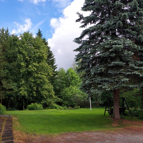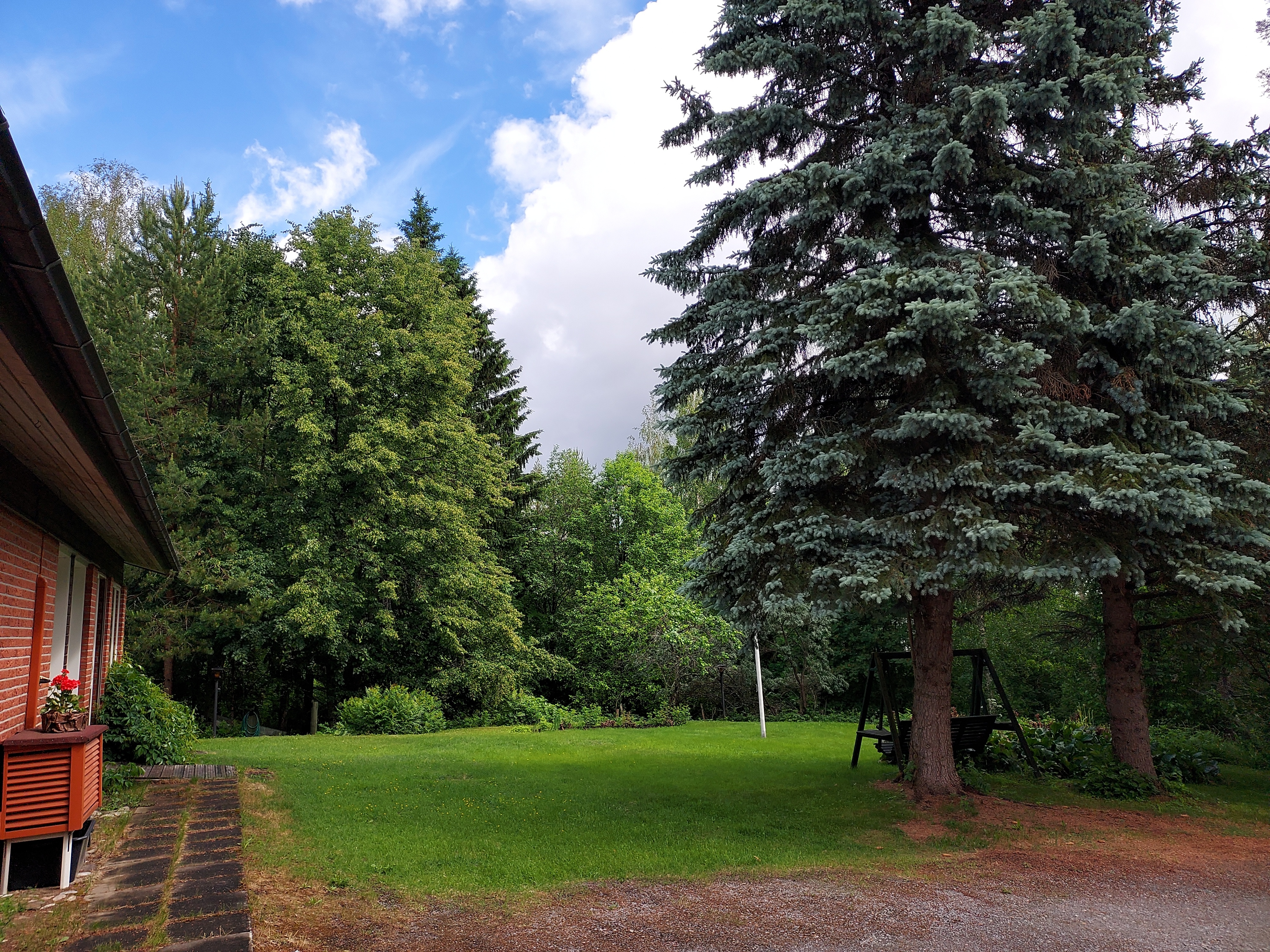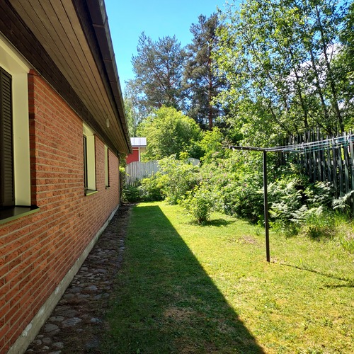 Vehreä puutarhatontti, mm. marja- ja tyrnipensaita, omena- ja luumupuita, angervopensaita, neilikkaruusuja, kanukkapensaita, perennoja ja kookkaita pihapuita.